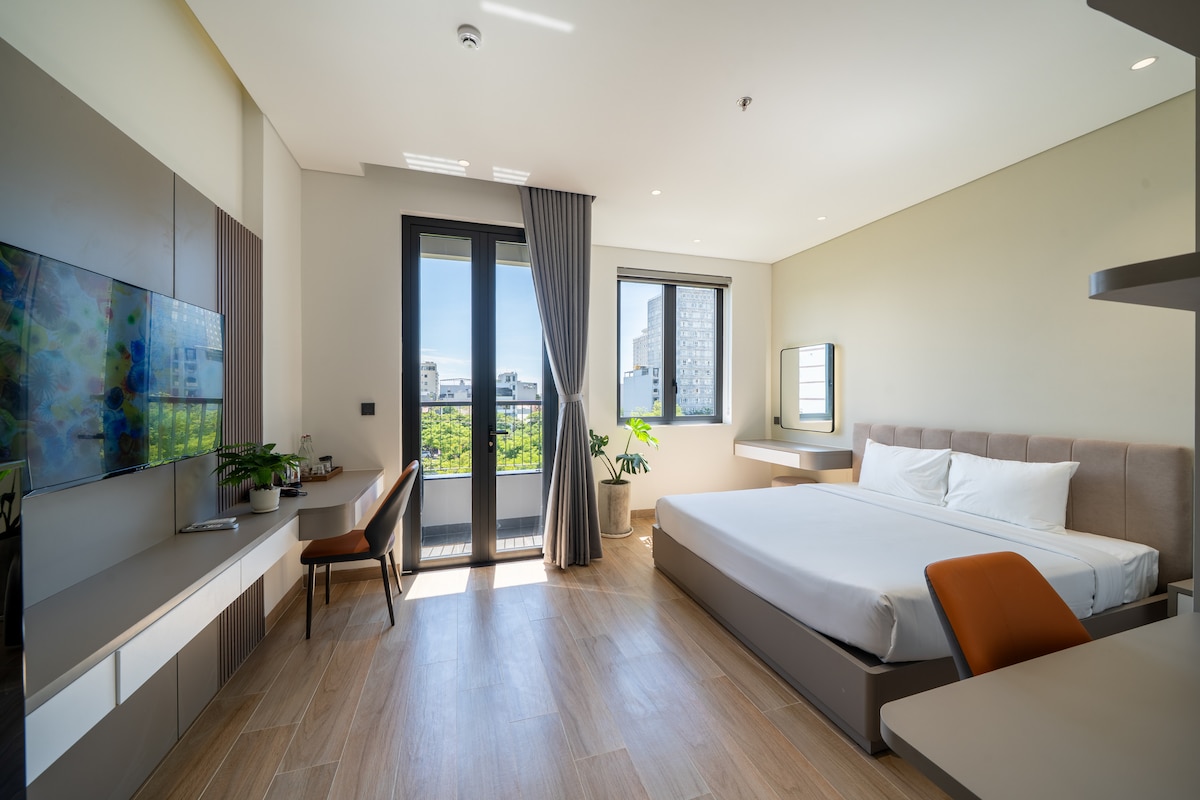 Denna helt nya studio ligger på 200 Võ Nguyên Giáp i den ikoniska A La Carte-byggnaden och erbjuder en hisnande direkt havsutsikt med en privat balkong – perfekt för att njuta av ditt morgonkaffe medan du beundrar det svepande blå havet, mjuka vita sanden och graciösa kokospalmer. Beläget mitt på Mỹ Khê Beach är det en idealisk tillflyktsort för par och vänner som söker avkoppling eller kreativa som arbetar på distans. Vakna varje dag till en spektakulär soluppgång och upplev den sanna essensen av ett paradis vid stranden