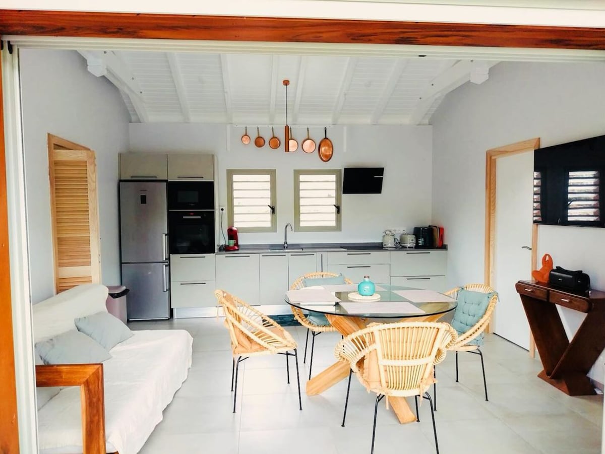 Njut av ett snyggt och centralt boende. Nära till alla bekvämligheter och perfekt beläget i Baie Mahault, denna nya bungalow (2025), bekväm och idealisk för 2 personer, erbjuder dig lugnet i ett separat luftkonditionerat sovrum med en dubbelsäng 160 cm. Du kan koppla av runt poolen i en zen/naturmiljö. Funktionellt, fullt utrustat pentry I lyxdistriktet Convenance är stället lugnt och grönt Stränder bara 10-15 minuter bort med bil. Flygplats 10 minuter.