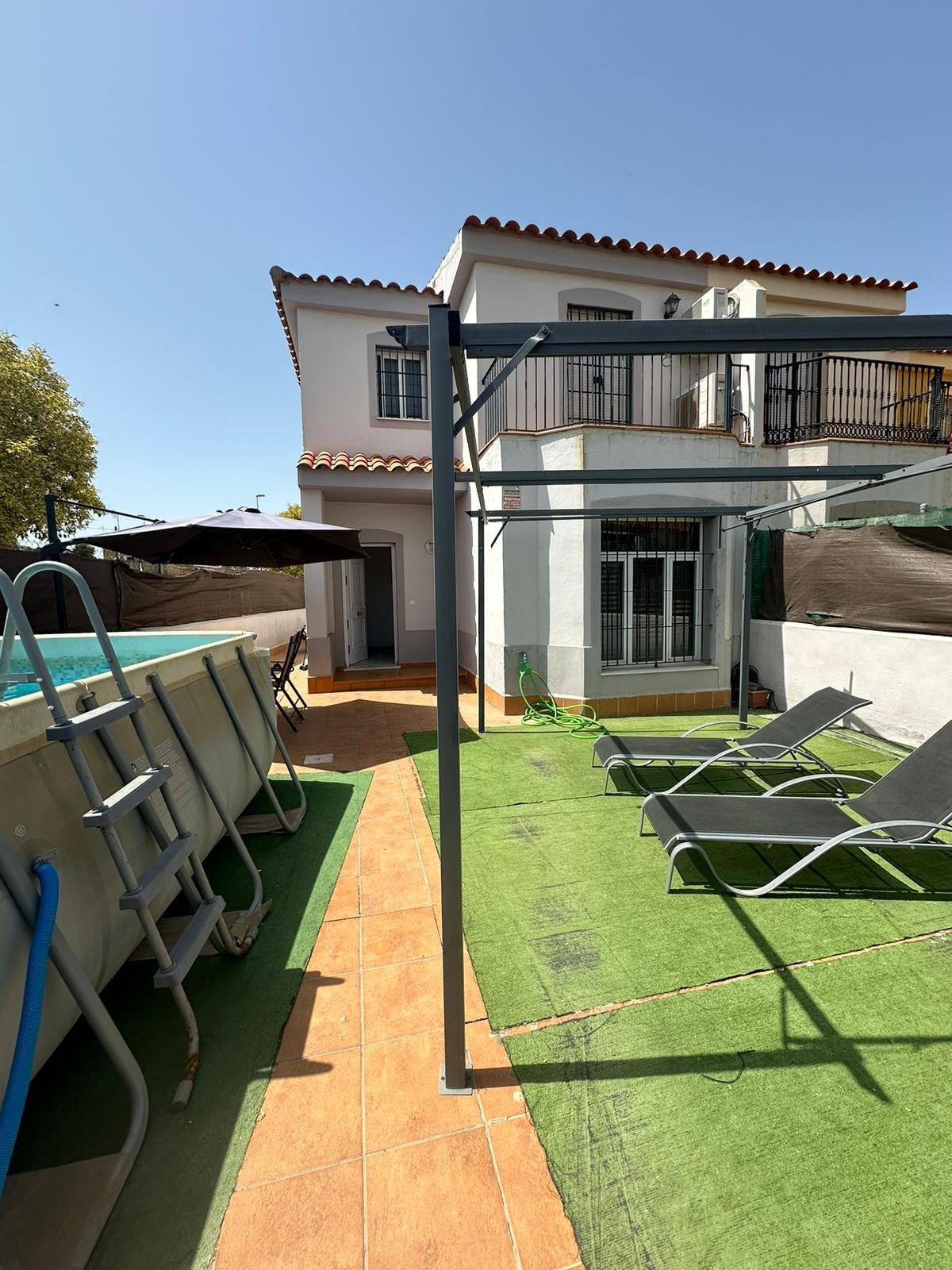 Chalet en parcela de 500 metros, con el mejor césped artificial, distribuida en porche de acceso a vivienda acristalada, salón, cocina completa, tres baños completos, uno de ellos en el exterior, salón con puerta de seguridad al jardín, tres dormitorios, el principal con baño interior. Aire acondicionado en toda la casa. En la zona de la piscina privada, hay cocina exterior con comedor y barbacoa de carbón y fuego de gas, totalmente completa. La casa consta de wifi, sabanas y toallas.