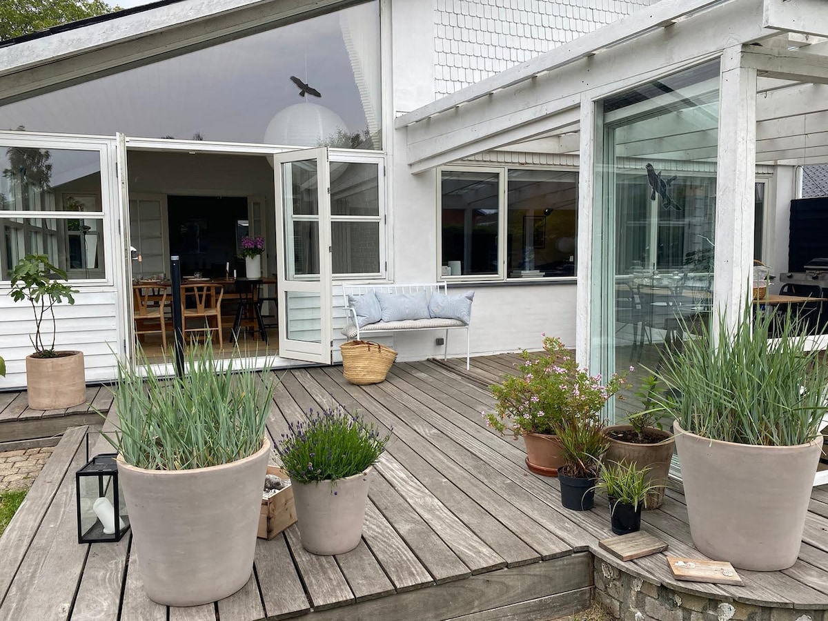 Med gott om utrymme i hela, erbjuder detta vackra och mycket "hyggeligt" sommarhus fem sovrum, inklusive ett separat gästhus med ett komplett badrum. Det är ett relativt nytt hem med elegant vintage charm, som ligger bara en kort promenad eller cykeltur från stranden och centrum av Hornbæk. Ytterligare höjdpunkter inkluderar en nybyggd bastu med en utomhusdusch.