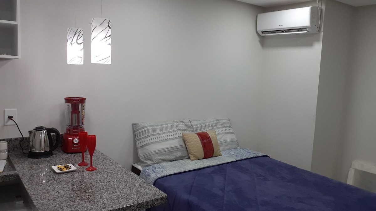 Lägenhet med bra läge, i stadens centrum, på åttonde våningen. Med 01 sovrum, badrum, balkong och integrerat vardagsrum med kök (alla välutrustade). Rymmer bekvämt upp till fem personer (en dubbelsäng 1,58 cm x 2,20 cm och två extra madrasser, en dubbel och en enkel). Garage med kapacitet för 1 fordon på högst 4,35 m i längd. - Queen-säng. - Stödmadrasser. - Luftkonditionering. -Smart-TV. -Wifi. -Säkerhetsskärm. - Tvättmaskin.