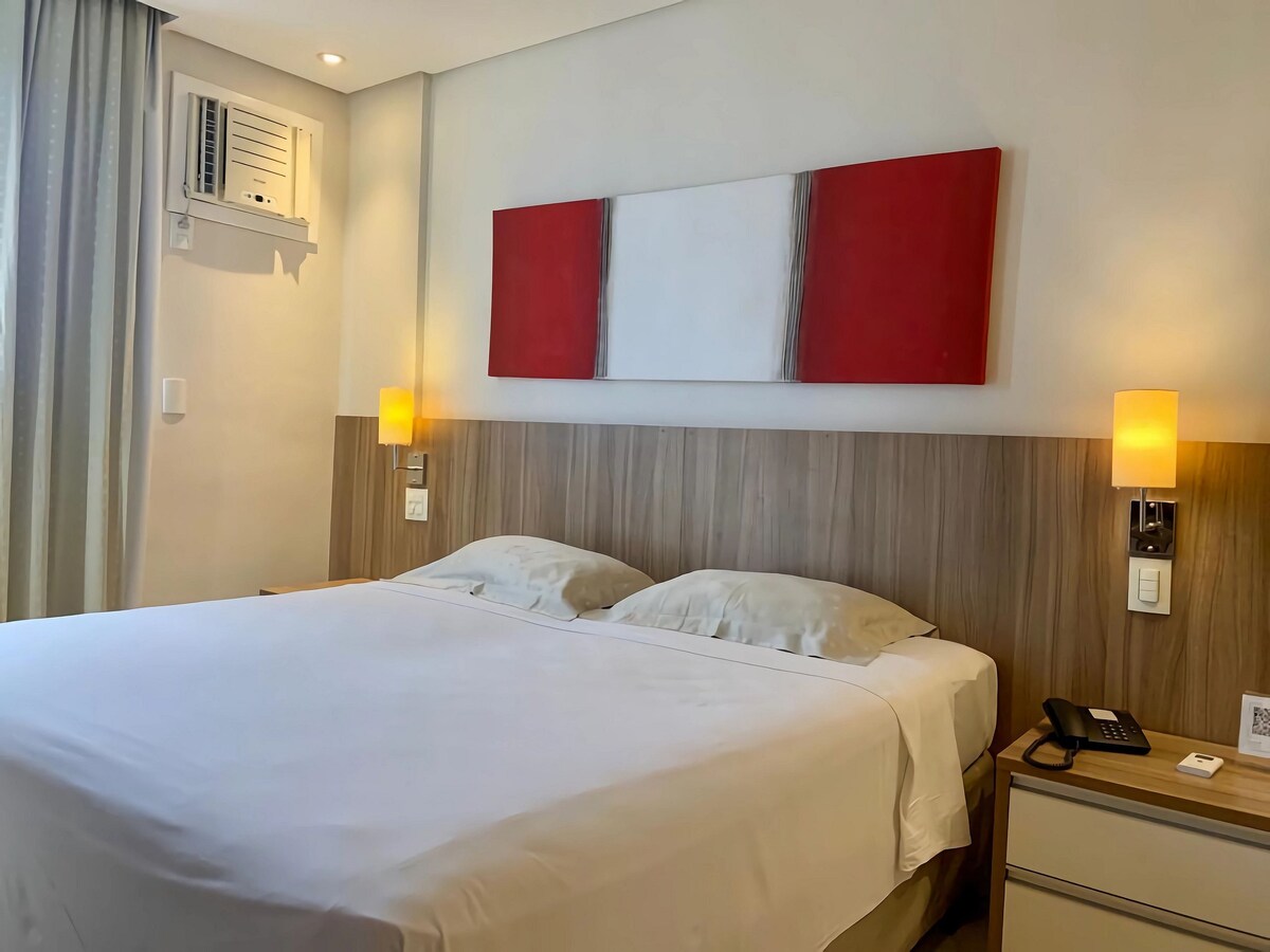 Flat in the Faria Lima building with kitchenette, workspace and double bed for up to 2 guests. Free parking and cleaning every 7 days for longer stays. The building offers a rooftop pool (7 AM–10 PM) and restaurant with breakfast (not included). 24h front desk. 📍 600m from Hospital de Base, 400m from Beneficência Portuguesa Hospital, 800m from Plaza Avenida Shopping and 1.3km from Riopreto Shopping. Apt 67, 6th floor.