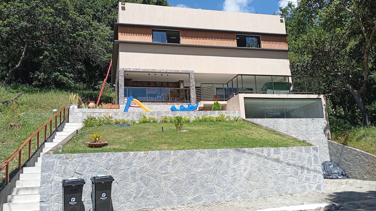 Charmig Recanto med massor av grönska och modern inredning i Águas da Serra condominium, en av de bästa i regionen, perfekt för familjer och barn. Beläget framför golfbanan, har det luftkonditionerade sviter, smart-TV, säng och badlakan, Wi-Fi, fullt utrustat kök och gourmetområde med grill. Njut av den rymliga trädgården, balkongen med hängmattor och utsikt över dalen. 5 minuter från centrum, med stormarknader och närliggande restauranger.