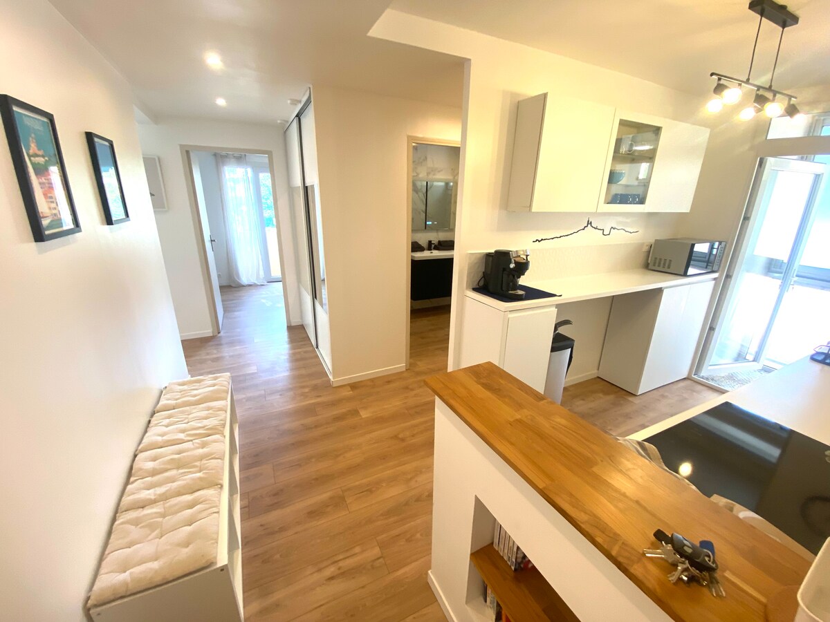 Välkommen till denna vackra, nyrenoverade T2-lägenhet Lägenheten är rymlig, ljus. Den består av: • ett mysigt vardagsrum med bäddsoffa och TV, öppet till en balkong. • Fullt utrustat öppet kök • ett lugnt rum med en dubbelsäng, med balkong • ett modernt badrum med duschkabin Privat parkeringsplats. Allt ligger inom gångavstånd: bageri, närbutiker, tågstation och naturligtvis hamnen och stränderna bara några minuter bort