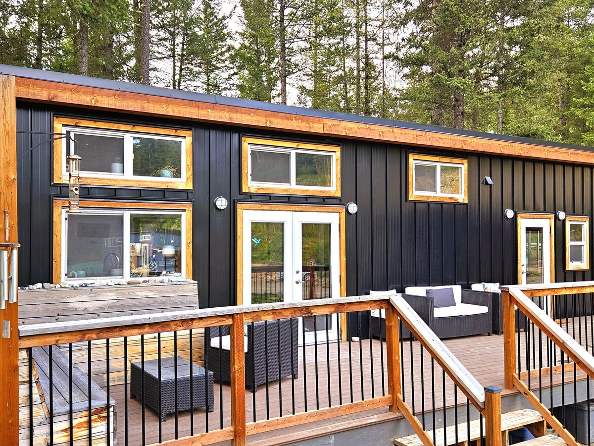Modernt minihus, omgivet av berg i de kanadensiska klipporna. Njut av bubbelpoolen, slappna av i trädhusets bastu eller på den rymliga altanen. ️ Perfekt beläget för äventyr: 6 minuter till centrala Golden 20 minuter till Kicking Horse Enkel åtkomst till Yoho, Glacier, Banff och Bugaboo Parks Queen-säng + utdragbar soffa Modernt kök med allt du behöver för att laga mat Komplett badrum med dusch Höghastighets-WiFi Delad bubbelpool och bastu i trädhus Egen altan med grillplats