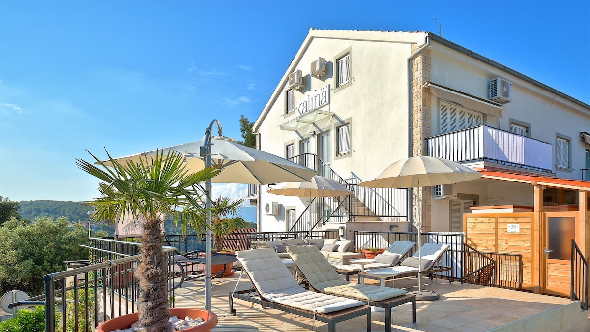 Bright and welcoming, KALINA is located in a quiet residential area. Only a few minutes' walk down into the town, our location enables incredible views overlooking the Adriatic, mountains, and the city. The sandy beach is just a short walk from the apartment, making Kalina an excellent spot for a family vacation.
