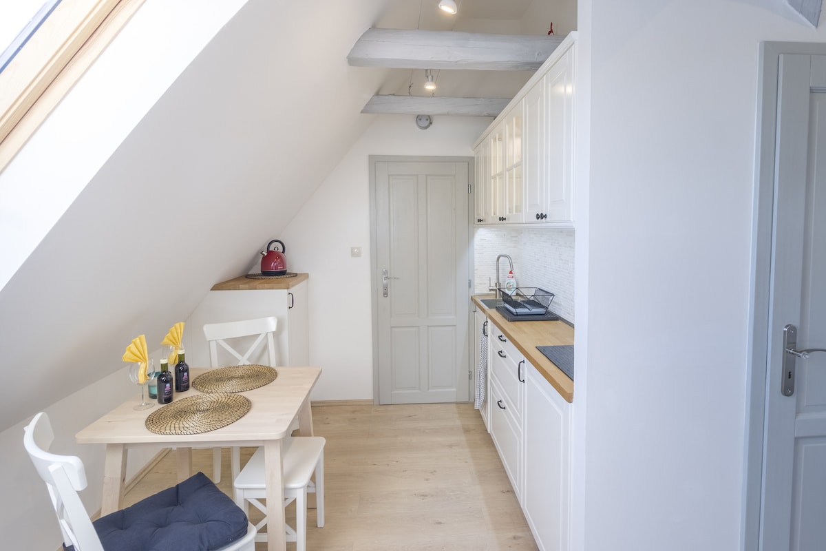 Stylish spacious apartment with private bathroom and kitchen close to the town centre, in which elements of historicist style are complemented by modern minimalism. The apartment is located in the historical building of the former Bretschneider shoe factory, which lies close to the square and other attractions, only a few minutes on foot. Nearby are to be found: restaurants, pubs, grocery shop, bowling, Glanzenberg mine. This accommodation is fit for couples, families or other groups of 4.