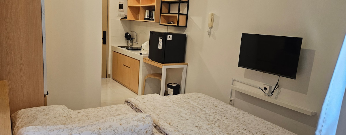 En rymlig, mysig lägenhet med ett sovrum, ett vardagsrum och balkong på Citralake Suites, Västra Jakartas perfekta semesterort vid sjön. Bekvämt beläget bara några minuter från flygplatsen, PIK, Puri Indah och Sunset Avenue, är det enkelt att utforska staden. Gå ut och du är bara 1 minuters promenad från Ciffest, en livlig matplats med massor av matalternativ, stormarknader och bankomater. Vår 1 BR-enhet erbjuder ett lyxigt och bekvämt utrymme för upp till 3 gäster, med en kokvrå, gratis Wi-Fi och Netflix.