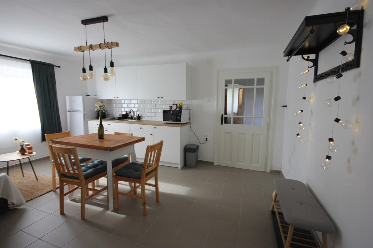 Byggd i en av de vackraste dalarna i vinregionen Szekszárd, väntar vår familj tvillinghus dig och dina vänner med en stor trädgård, vingård och skog. Grannskapet erbjuder dig möjlighet att besöka dina favorit ungerska vingårdar, vandra, släde i sanddynerna på vintern eller dyka tillbaka i värmen i eldstaden, laga mat, spela, läsa. Hela huset och trädgården står till våra gästers förfogande. Med kök, matrum, stort vardagsrum, två badrum, toalett och tre sovrum.
