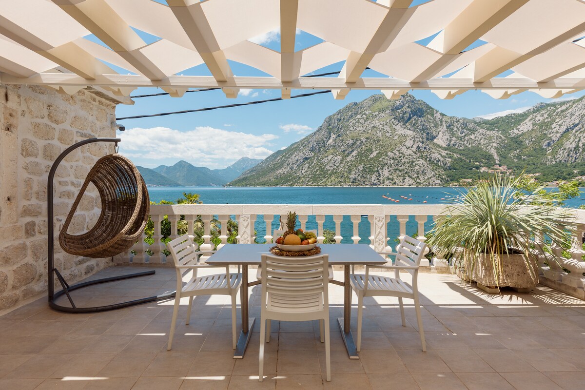 Detta gamla stenhus vid vattnet byggdes ursprungligen på 1800-talet och totalrenoverades 2018. Inredningen representerar en blandning av traditionell medelhavsstil i kombination med modern design. Beläget i en lugn gammal fiskarby som heter Muo, är vårt hus perfekt bas för att utforska bukten. Gamla stan i Kotor ligger mindre än 10 minuters köravstånd medan Tivat flygplats ligger mindre än 20 minuter bort. Huset har tre våningar och varje nivå har ostörd havsutsikt.