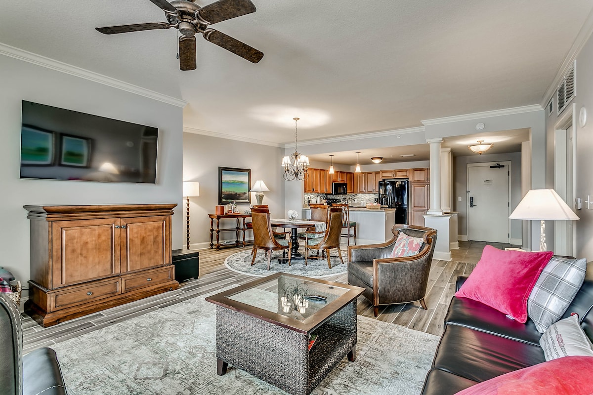 Koppla av i denna uppdaterade lägenhet vid havet på Beach Colony Resort. Med moderna möbler, en plysch king size-säng, bäddsoffa, fullt utrustat kök och ett rymligt badrum har denna retreat allt du behöver för en lugn semester. Resorten har något för alla med bekvämligheter som uppvärmda inomhus- och utomhuspooler, bubbelbad, lazy river, tiki bar, restaurang, kaffe- och presentbutiker, gym, bastu, arkad och vackert anlagda gräsmattor med parasoll, hängmattor, solstolar och glidbanor.