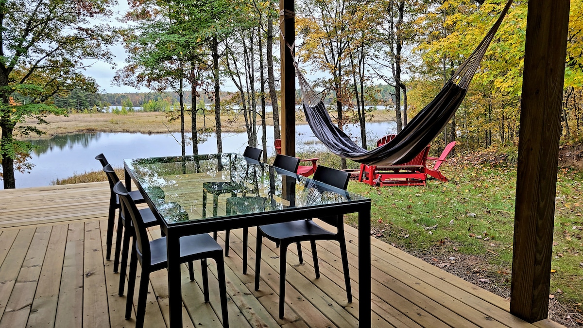 Rustic Elegance + Northwoods Flare + Island View Panorama + Fully Electric + Front Porch 10 minuter från Hayward, The Glamping Cabin's rymliga halvöppna golvplan har 2 sängar, fullt utrustat kök, disk, redskap och ett genomtänkt vattensystem i lägerstil. Vinterdagar är varma + mysiga med Row-0-Flames värmare. Duschar är utomhus när temperaturen är över 32 grader eller bredvid Loon Lake Guesthouse när det är kallt ute. Din "toalett" är en färgglad utomhustoalett. Helt elektrisk med WiFi