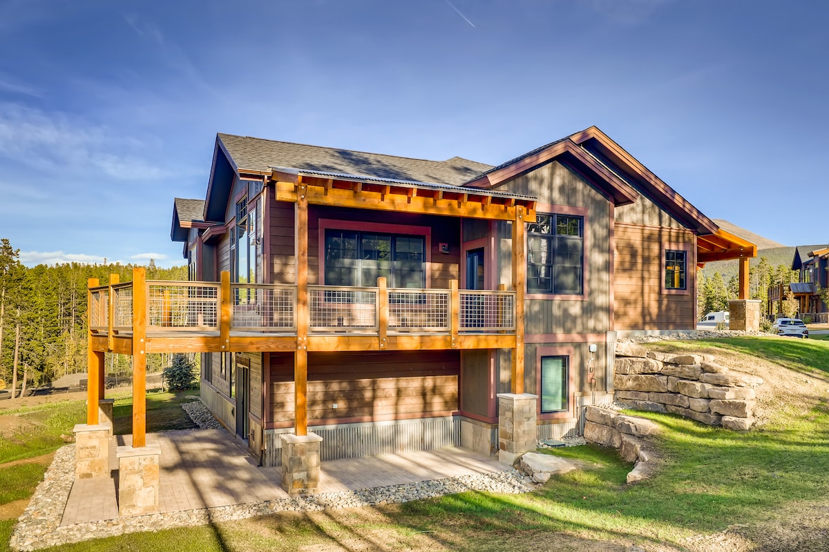 Contemporary, comfy mountain retreat townhome nestled in the trees w/ vaulted ceilings that feels like home! Peak 9 lift, restaurants, shops, bars walkable LESS THAN 10 MINUTES! Spacious OPEN-CONCEPT living, fully-stocked kitchen w/ granite countertops - Cook or Entertain. Cozy Fireplace, Grill, PRIVATE large NEW hot tub & big deck! 3 KING beds in bedrooms +custom King sleeper sofa! Master on separate floor. Luxury linens and towels! Private garage fits full SUV. Full W/D.