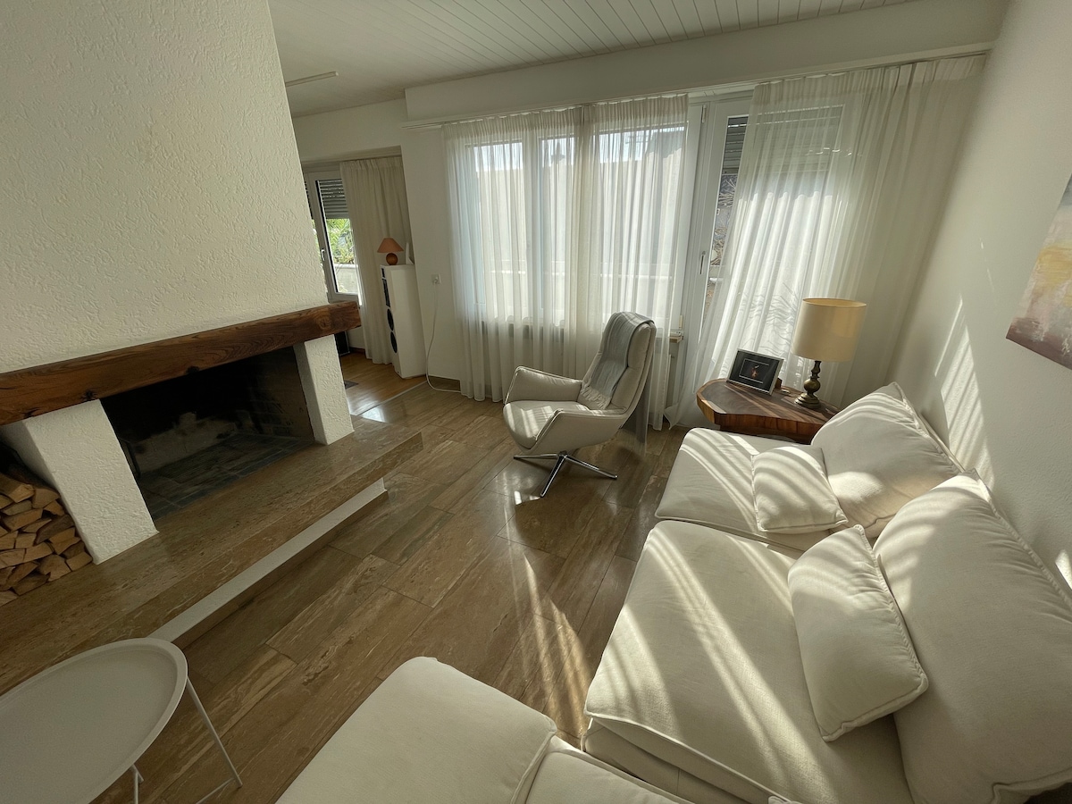 Lugnt boende med direkta transportförbindelser till Basel (18 minuter med spårvagn från Basel SBB). Byns centrum med många shoppingmöjligheter ligger 3 minuters promenad bort. Mycket lugnt läge trots att det ligger nära staden. Fastigheten ligger intill vårt hus, tillgången går genom trädgården. Utrymmet kan värmas upp av en vedeldad spis. Vi är en familj på fyra, med en mycket tillitsfull Cocker Spaniel samt 3 kycklingar. WiFi kan endast användas i trädgården (rumsväggarna är för tjocka)