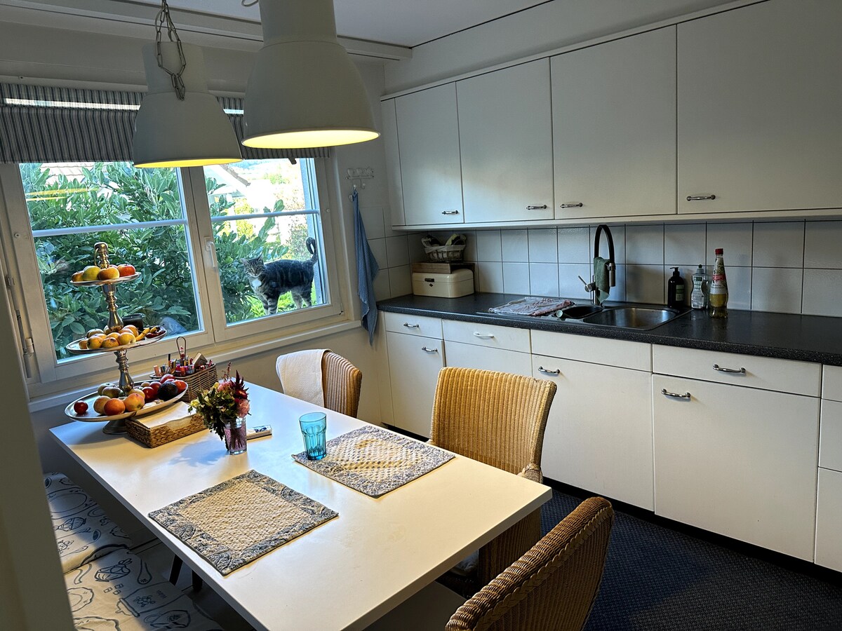 Charmigt fristående hus i lugn återvändsgränd i Magden, perfekt för familjer eller grupper. Ljusa rum, bastu, gym och stor trädgård erbjuder gott om utrymme och komfort. Shopping, pool och lekplats är mycket nära. Perfekt för natur- och utomhusälskare med vandrings- och mountainbike-leder direkt utanför dörren. Bra anslutning till Basel och Zürich, bussanslutning bara 200 meter bort. Njut av avkoppling och aktiviteter på det bästa läget.