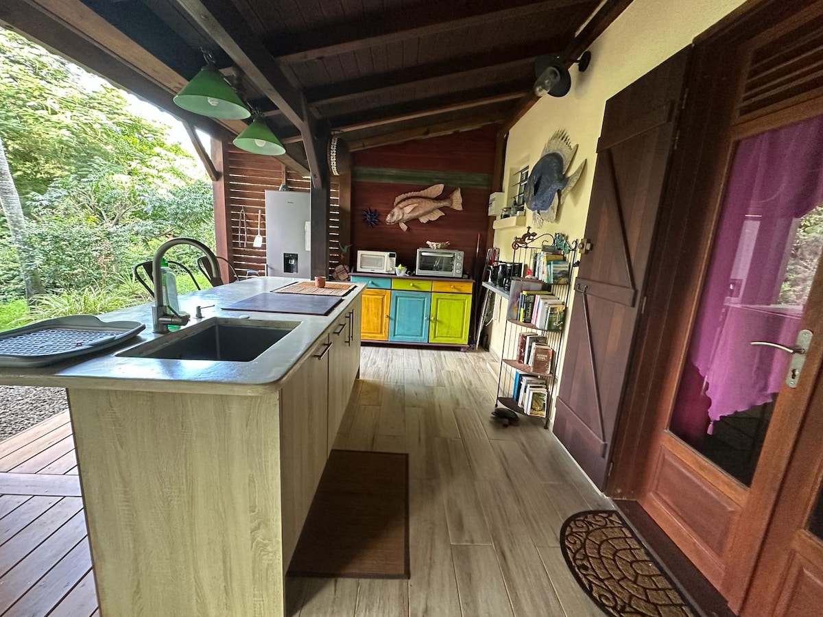 Njut av den charmiga miljön i detta romantiska boende mitt i naturen. Beläget mitt emot Saintes-bukten, känd som en av de vackraste i världen. Denna kreolska hydda är ekologisk eftersom den är helt i trä och självförsörjande i vatten och el. (regnvatten och solenergi). Utomhusduschen vid rumstemperatur i en grön omgivning kommer att erbjuda dig en garanterad förändring. Köket är designat och möblerat i kreolisk anda och ger dig all utrustning som behövs för en drömsemester.