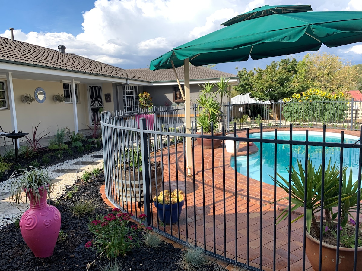 Snygg privat villa centralt belägen, med en enkel promenad till CBD, Charles Sturt University och Mt Panorama. Fullständigt utbud av FOXTEL-stationer och obegränsat Wi-Fi. Njut av kanalvärme och kyla och under de varmare månaderna är du välkommen att använda grillen och poolen. Kvalitetsmöbler och alla lakan/handdukar tillhandahålls. Perfekt för en weekendresa på landet och även väl lämpad för en längre vistelse. Minst 4 nätters vistelse under Bathurst bilrace-evenemang.