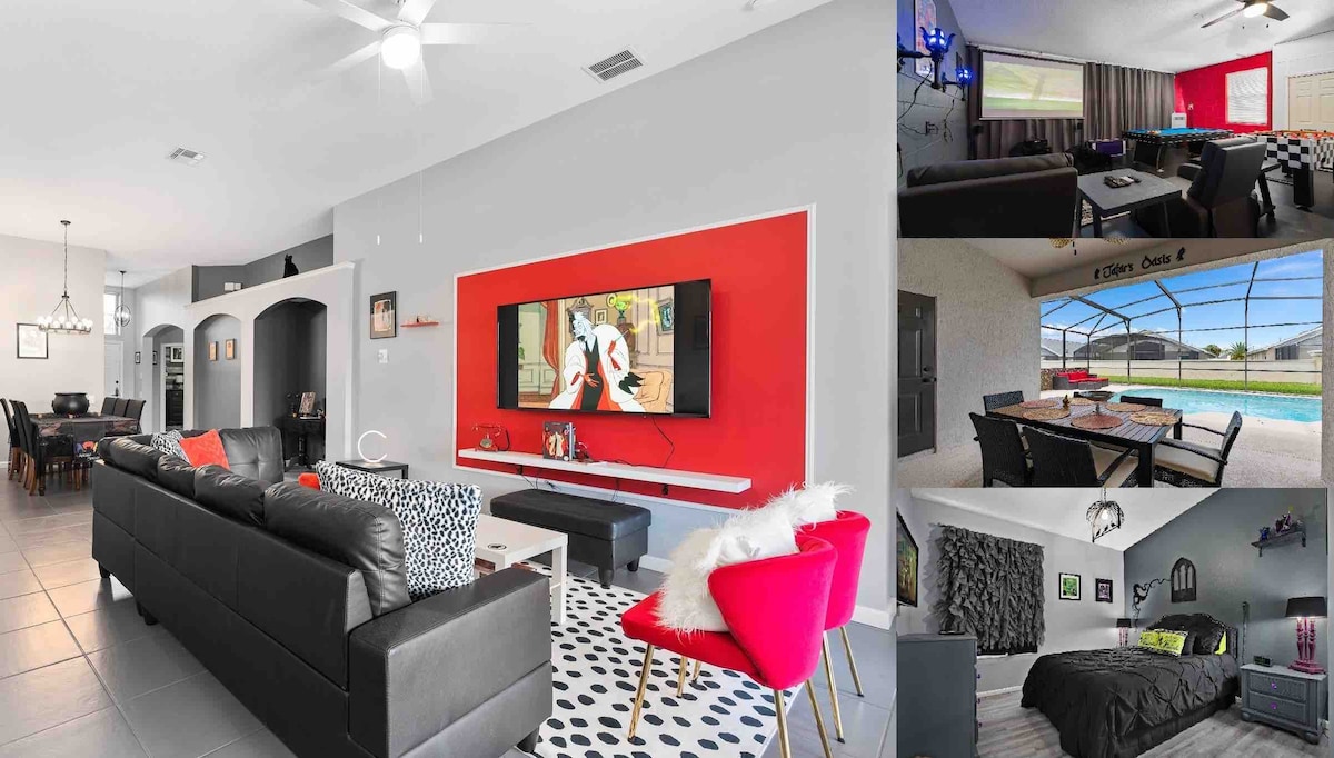 Lämna inte Disney Magic i parkerna – upplev det genom att komma hem till ditt rymliga 5 BR med 2 King-sviter, 3,5 badrum och nyrenoverad design. De höga taken och den öppna planlösningen gör det perfekt för familjetid, medan den privata bakgårdsoasen, komplett med pool och spa (uppvärmning valfri) och Tiki Bar, erbjuder ett bra utrymme för avkoppling. Temarummen, inklusive Star Wars, Frozen och Mickey & Minnie, ger en rolig och nyckfull touch som är perfekt för gäster i alla åldrar.