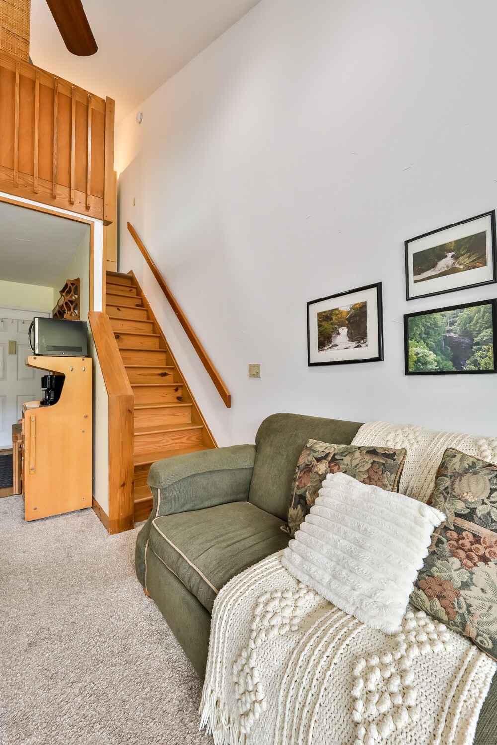 Lev det enkla livet i mitt fridfulla och centralt belägna loft. Du är vid foten av Hunter Mountain, precis bredvid Dolan's Lake och en mycket kort bilresa till alla Village of Hunter restauranger, barer, kaféer, vandringar och bekvämligheter. Du kan enkelt promenera till Hunter Mountain och Trailways busslinje. Lägenheten har eget wifi och 2 Roku TV.