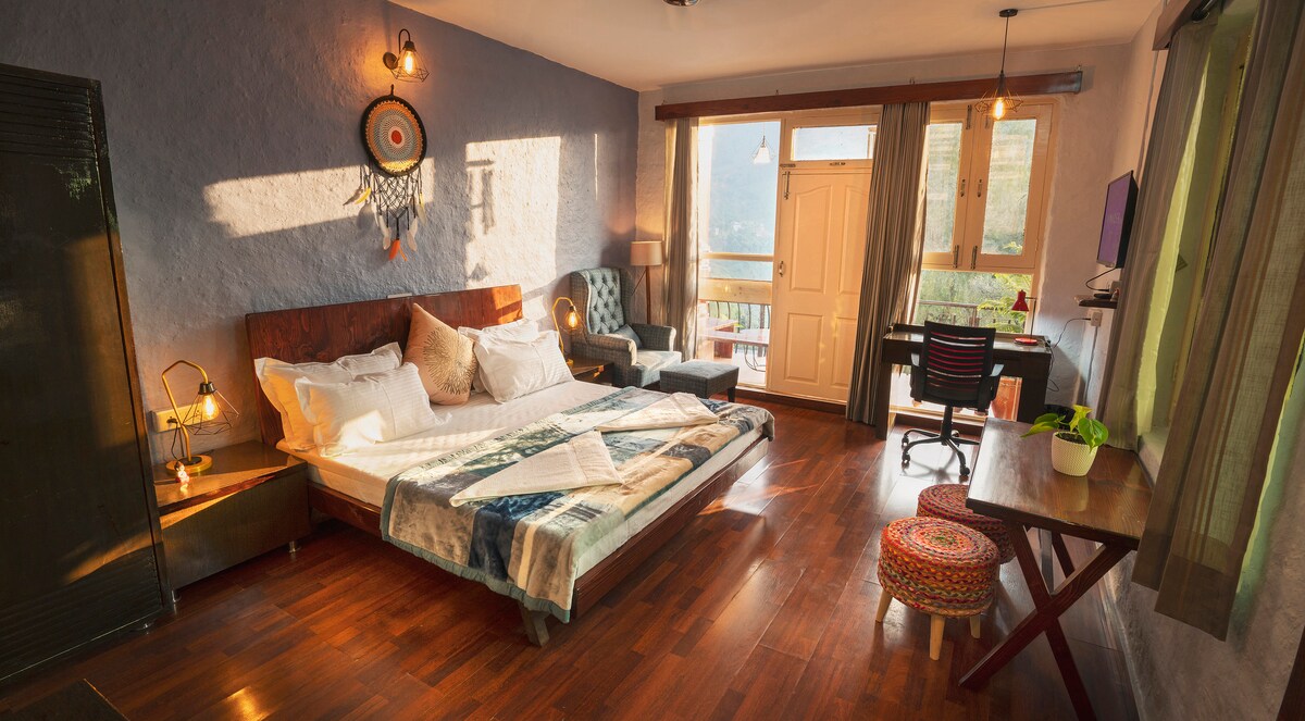 På ChaletShanagManali upplever du ett ofiltrerat band med naturen när de underbara snötäckta bergen och de grönskande utsikten omfamnar dig, i all sin renhet. Denna lyxigt magnifika villa har fyra sovrum och utstrålar rustik charm i trä, tillsammans med jordnära färgpaletter och natursköna matställen utomhus. Se snöflingorna glida mot marken när du badar bastu eller myser med dina nära och kära vid eldstaden för att dela skratt och berättelser.