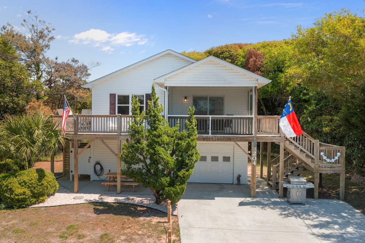 Upplev kustliv när det är som bäst i denna 4BR/3.5BA Beaufort reträtt, mycket nära Beaufort Hotel. Starta en av fyra kajaker för att upptäcka Carrot Island, eller skapa minnen i vårt viltfyllda garage med pingis, cornhole och ringkast. Strandstolar och utrustning tillhandahålls! Åk till centrum vid vattnet (5 cyklar) eller hyr golfbil. Eller njut av den gemensamma bryggan, poolen, klubbhuset och sjön, i grannskapet....Ta ditt morgonkaffe eller eftermiddagscocktail nere vid bryggan.