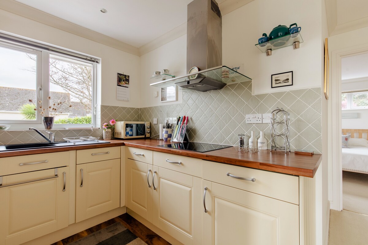 A beautiful open plan studio apartment, furnished to the highest standard for self-catering with a fully equipped kitchen with oven, grill, hob, fridge, microwave. There is a dining area, lounge equipped with a TV and a great wet room. Outside is a private patio area with sun loungers and bistro set. Ample parking on drive. A cream tea awaits you on arrival. 1 night bookings only accepted Sun-Thurs. 3 night stays in the summer preferred, but ask to see if we can accommodate you.