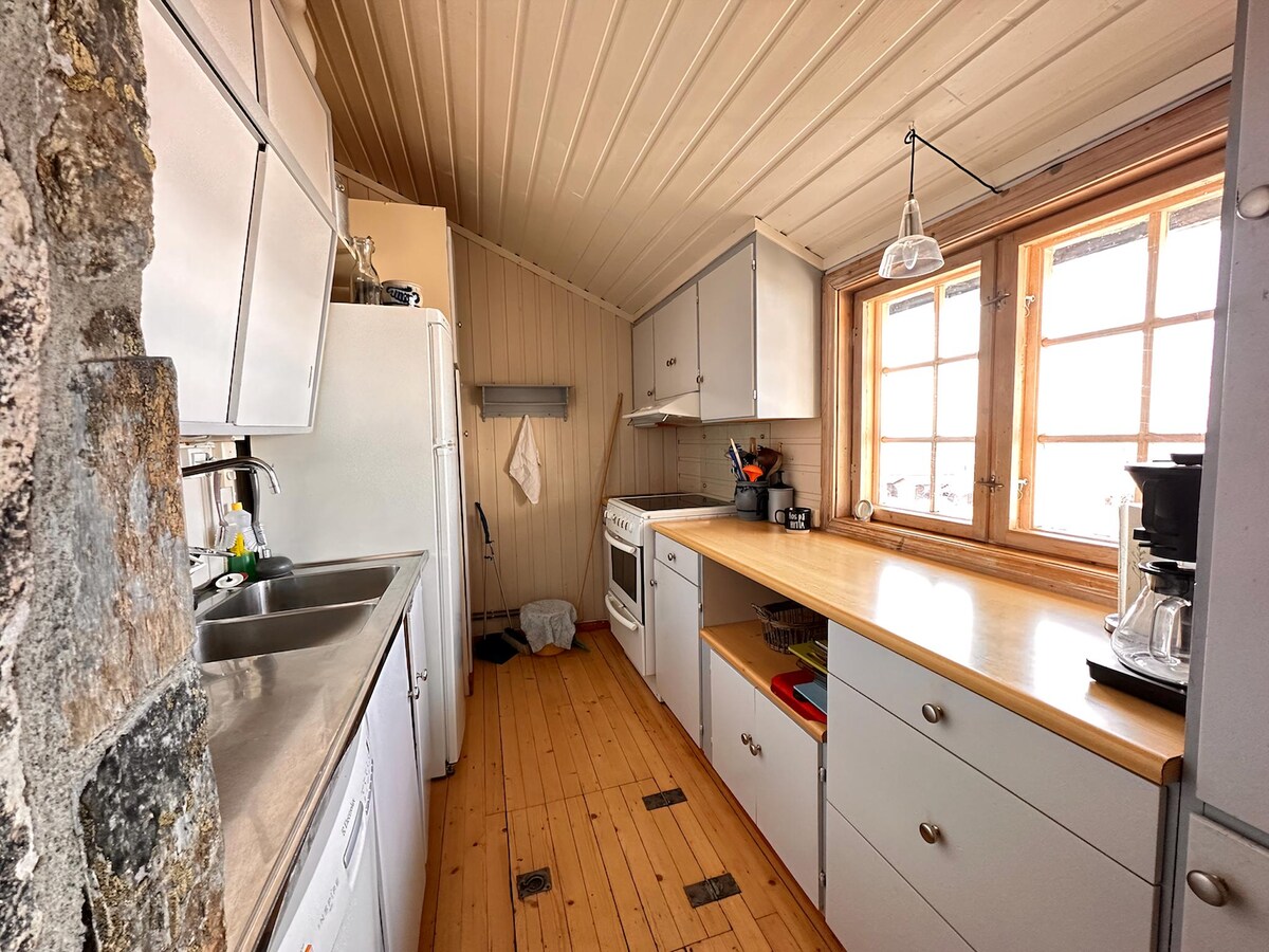 Mysig lägenhet på översta våningen med öppen spis och bastu