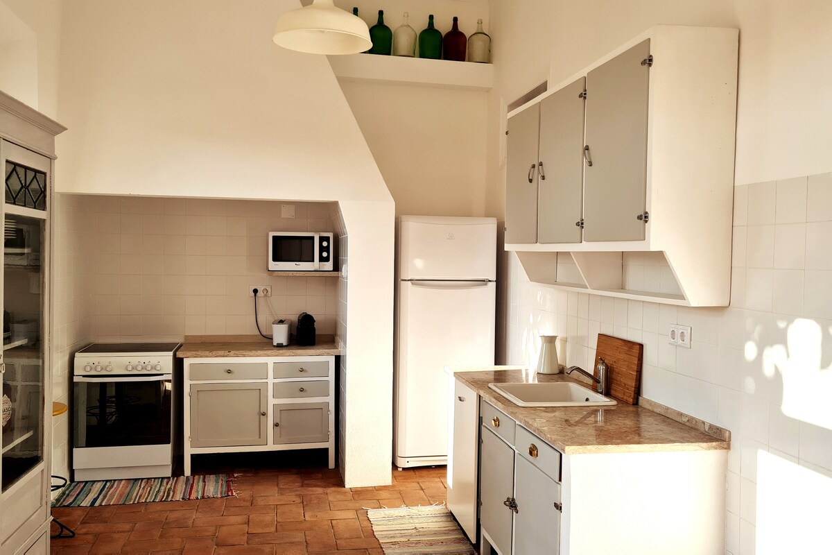 I byn Salvada, 16 km från Beja, kan du njuta av en lugn vistelse i detta mysiga hus i rustik stil på marknivå med tjocka väggar vittkalkat, idealiskt för upp till 6 personer. Ett perfekt utrymme för att koppla av, ta en paus från vardagen och njuta av naturen med fullständig integritet. Boendet inkluderar: 1 sovrum med en dubbelsäng och en salamander 2 sovrum, vart och ett med 2 enkelsängar Wifi 1 komplett badrum Fullt utrustat utomhuskök. Vardagsrummet Matrum och vardagsrum med kamin