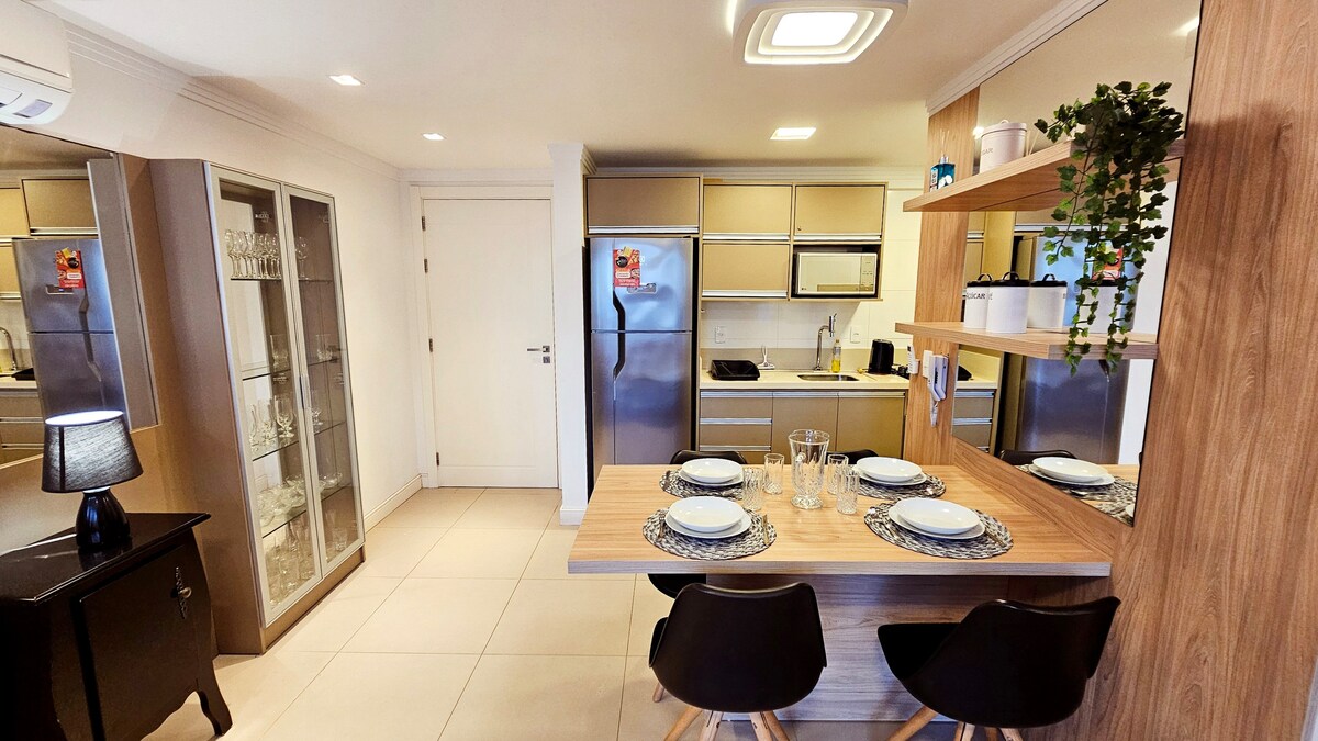 Några meter från den vackra Praia da Cal och Lagoa do Violão, kombinerar denna eleganta studio praktiskhet och hög standard. Omgiven av den naturliga skönheten i Morro do Farol, har den en queen-size säng, skräddarsydda möbler, 46'' vridbar TV, tvättmaskin och torktumlare, stor balkong med sidovy över havet, samt en utrustad grillplats och fullt utrustat kök. Lägenheten har ett garage, en balsal, gourmetutrymme, uppvärmd pool och en altan med havsutsikt.