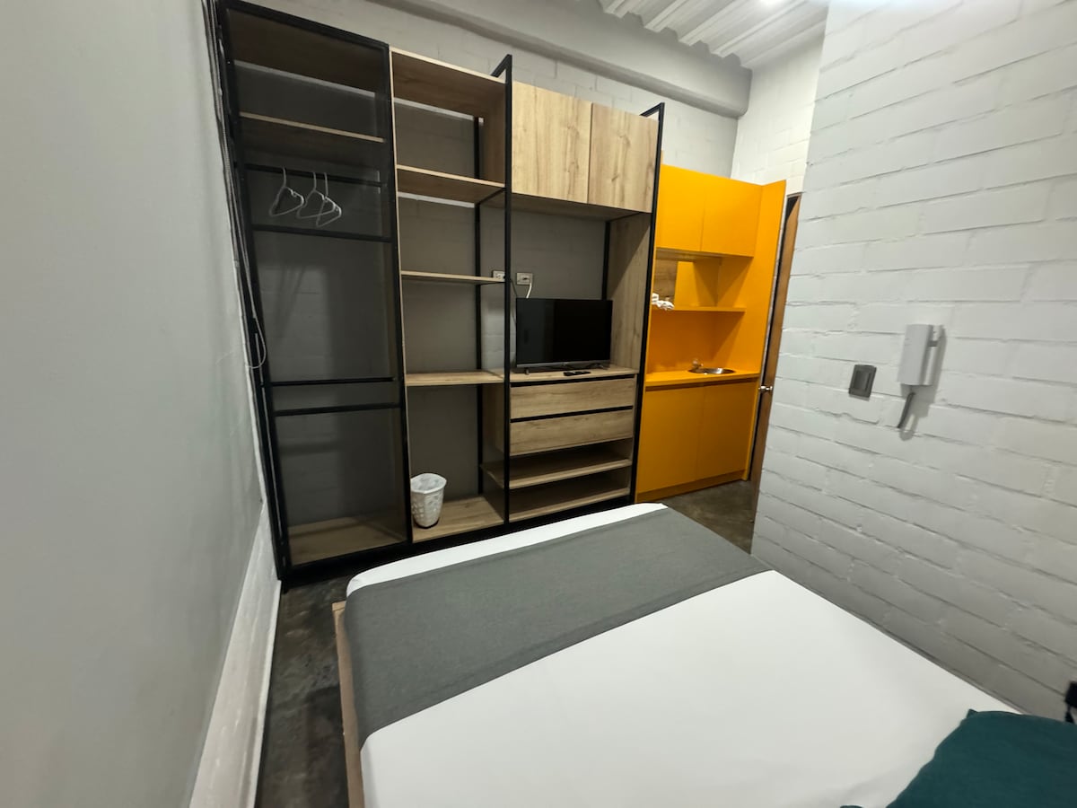 Enkelrum med 1 dubbelsäng, lakan, luftkonditionering, 400mb fiberoptiskt internet, TV, garderob, kylskåp, privat badrum, varmt vatten, handdukar och tvål för kropp och händer. Boendet ligger i det mest exklusiva området i Cali. Nära de bästa rosa områdena som El Peñon, San Antonio och Granada. Nära turistattraktioner som djurparken, El Gato de Tejada och Boulevard del Rio.