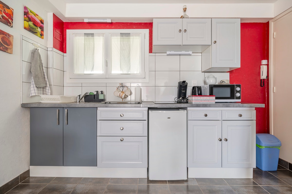 Oberoende studio som ligger på bottenvåningen i ägarens villa. Egen ingång, fullt utrustad, med kök, badrum och med uteplats, nyrenoverad. Gratis parkering Frukost ingår Motorcyklister och veteranbilar är välkomna. För att kunna rengöra studion ordentligt och desinficera den efter varje vistelse, ombeds du att lämna studion på morgonen så länge viruset sannolikt kommer att cirkulera.