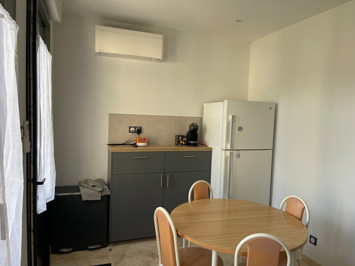 Litet nytt boende inklusive: - ett inrett kök (diskmaskin, spis, ugn, mikrovågsugn, kaffe ...) - ett sovrum med dubbelsäng - en mezzanin med dubbelsäng (lämplig för barn) - badrum (dusch) - terrass - TV - Internet - barnstol på begäran Bara 25 minuter från Angers och 45 minuter från Puy du Fou. 17 minuter från djurparken Bio Parc de Doué-la-Fontaine. Lakan och handdukar ingår inte, en avgift på 5 €/säng tillkommer på plats om det behövs.
