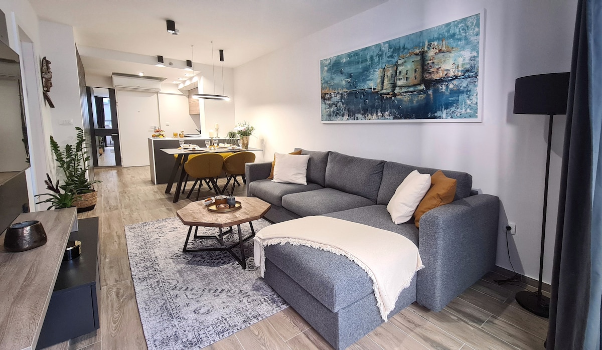 Njut av elegant och modernt designad lägenhet i nybyggd byggnad med hissar och privat parkeringsplats i garaget. Lägenheten har fullt utrustat kök, stor TV synlig från vardagsrum och sovrum. Sovrumsområde med en stor bekväm säng. Toalett med gratis toalettartiklar, hårtork och handdukar inklusive strandhanddukar till ert förfogande. Allt du behöver för bekväm vistelse i Dubrovnik. Närliggande buss- och taxistation, restauranger, stormarknad, sjukhus, bank, marina och huvudhamn.
