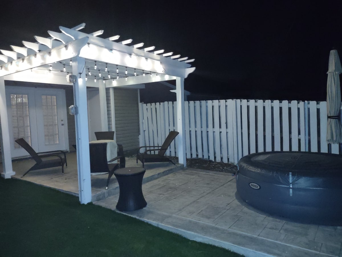 Flyg in i The Relaxation Spot! Flygplatshangaren har alla bekvämligheter som behövs för att göra din mellanlandning oförglömlig! Sitt i baren och njut av en drink, slå på den färgskiftande eldstaden, titta på 70-tums-TV i underhållningscentret med toppmoderna högtalare, liggande filmstolar, sätt din drink på flygplanets vingbord. Koppla av utomhus under paraplyet, lampor och spela ett spel hacky sack. Dessutom för att uppnå den ultimata avkopplingen från dina trötta resor koppla av i bubbelpoolen!