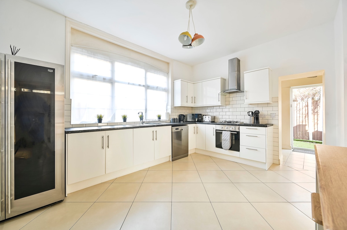 Välkommen till vårt nyrenoverade hem med 4 sovrum, perfekt för familjer och yrkesverksamma. Rymmer bekvämt upp till 8 gäster med king size-sängar och dubbelsängar. Njut av en rymlig trädgård, vinterträdgård, träningsutrustning och ett fullt utrustat modernt kök. Funktioner inkluderar snabb WiFi, en 65-tums 4K-TV och gratis parkering på gatan. Beläget nära parker, tennisbanor, lekplatser, affärer och tågstationen – bara 25 minuter till centrala London. Snyggt, bekvämt och bekvämt.