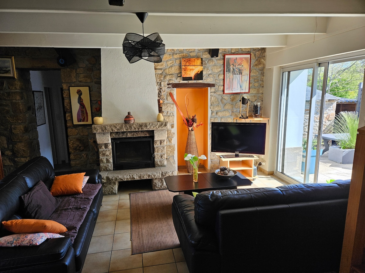 Stenhus i lugn by. Balkar och synliga stenar. Eldstad med insats 1 inhägnad innergård och 1 liten trädgård framför huset. Grill, trädgårdsmöbler och solstolar. Gratis tillgång till: 2 kajaker + västar för att segla på Blavattnet Blavet 100 m, 2 stads-cyklar. Fiberbostad Livebox 1Gbit/s i mottagning och 700 Mbit/s i sändning. Kökshanddukar, soppåsar och rengöringsprodukter. Kaffefilter, socker, kryddor, salt, oljor ... Aluminium...
