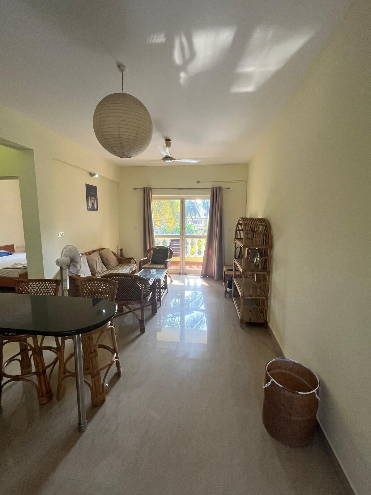 This 1-bedroom, 1 drawing room flat with 2 bathrooms located a mere 100 meters from Famous Benaulim beach in South Goa, offers an ideal setting for both families and couples. 88,2611%2593 Featuring a spacious living area connected to a modern open kitchen equipped with all essential amenities, residents can step into a large balcony to admire the Arabian Sea View. The interior layout boasts a bar-style design. Guests have access to WIFI and backup power via Society Generators.