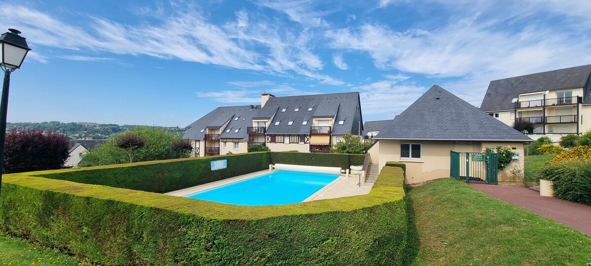 15 minuters promenad från de berömda strandpromenaderna i Deauville, 5 minuter från kapplöpningsbanan i Clairefontaine, denna mysiga lägenhet på 50 m2 ger dig möjlighet att koppla av och har ett privilegierat tillträde till stranden. Restauranger vid havet, uppblåsbara spel, studsmattor, vattensporter, du kommer att vara 100 m från stranden, nära alla bekvämligheter. Privat parkering, hiss och tillgång till en utomhuspool på sommaren. Total autonomi tack vare hushållsutrustning. Sängkläder av hotellkvalitet. Välkomnande av concierge.