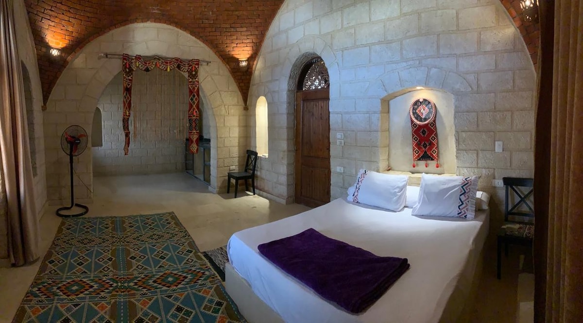 Rustikt rum med utsikt över Wadi Elrayan Lake och öknen