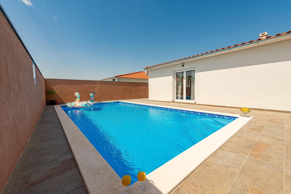 Semesterhus Jona ligger i en liten by mitt i "Ravni Kotari". Huset ligger på en 7 000 kvadratmeter stor ranch som har en stor pool endast för gäster och är omgiven av vingårdar och olika fruktträd som gäster har till sitt förfogande. Huset är idealiskt för en komplett drömsemester där du har råd med fullständig sinnesro. House Jona är ny och fullt utrustad med diskmaskin, tvättmaskin, kaffebryggare, grill, luftkonditionering, wi-fi internet, ultratunn TV, etc.
