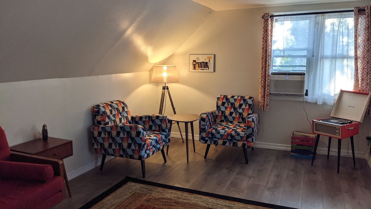 Res tillbaka i tiden lite med vår charmiga 2:a våning i en lugn, trygg förort. Parkering ingår på plats. Vintage, välkomnande atmosfär. Vi är en 20-30 minuters bilresa till centrala Chicago (beroende på trafiken). Enheten ligger på 2:a våningen och är åtskild från resten av huset (vi bor på 1:a våningen). 1 Dedikerad gästparkeringsplats (ingår). Ytterligare gratis parkering finns. Bra wifi. 3-säsongs veranda. Skivspelare (äkta vinyl!)