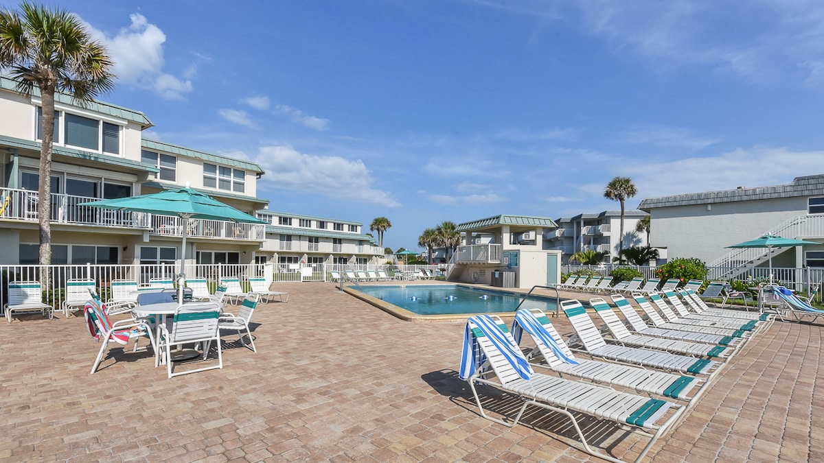 Vid stranden fri panoramautsikt över fotona bara antyds fotona. Strand, pool och stor gräsmatta utanför din privata uteplats. Fantastiskt läge vid stranden. Du kanske till och med ser en raketstart – det är fantastiskt! Avslappnad strandhusinredning. 2/2.5 radhus, 1 bilgarage. Lugn stadsby. Livsmedel och butiker bara 800 meter bort - promenadbar! 1 hund är ok-klicka på husdjursavgiften på betalningssidan. POOLEN är INTE uppvärmd men är öppen året runt. Inga bilar eller hundar tillåtna på denna del av stranden. Unit A-3, 4203 S. Atlantic.