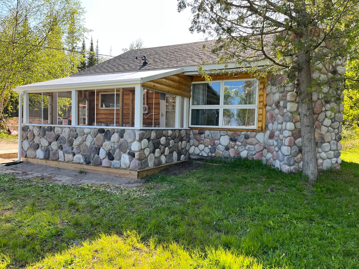 Njut av denna avskilda stuga när som helst på året. Beläget nära spår 8/H-58 för dagsutflykter i vilken riktning som helst. Stugan är utrustad med 2 Queens och rymmer 4 personer bekvämt. Två propaneldstäder och främre rum med vacker utsikt över privat sjö. Propan Weber för grillning, varm dusch, fyllt kök, tvättmaskin och torktumlare. Eldstad för lägereld med trä för köp på plats. TV med HÖGHASTIGHETSINTERNET. Troligtvis kommer du att se och eller höra ett vilt djur.