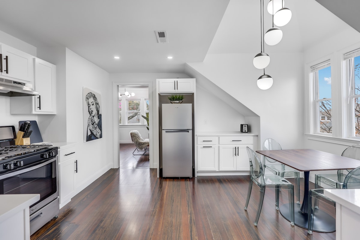 Fråga om våra vinterhyror! VIKTIGA FUNKTIONER: ☀️Reserverad parkering för 1 fordon ☀️Fullt utrustat + utrustat kök ☀️Nya vitvaror i rostfritt stål ☀️Ljust och ljust utrymme med fyra överdimensionerade fönster ☀️Smart 4K-TV ☀️Keurig med gratis kaffe ☀️Familjevänligt! Vi tillhandahåller pack and play, barnstol, dörrvakt och barnvagn. Du behöver inte packa för mycket med all den där babyutrustningen! ☀️Futon som förvandlas till en säng i full storlek ☀️Massor av naturlig belysning