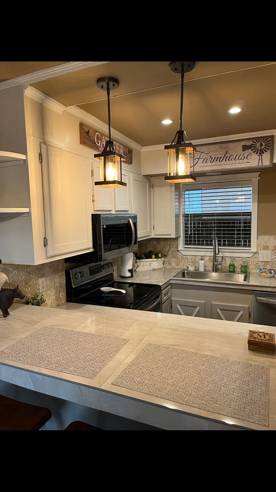 Sleeping: Features a Bunk Bed layout (2 Full Beds). Kitchenette: Includes Cooktop, Fridge, and Microwave (No full oven). Climate: Equipped with a modern Mini-Split A/C system. Laundry: Washer & Dryer are included (Detergent not provided).