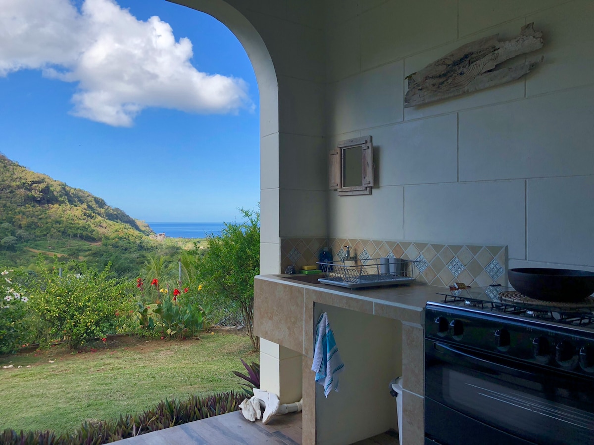 Ingen luftkonditionering Privat, rymlig sten villa Jalousie-fönster 4 posters dubbelsäng Utmärkt WIFI Fin konst & inredning Anlagda trädgårdar Fantastisk utsikt Vandring: Bush Bar 10 minuter Dewi's Asian Kitchen 10 minuter Vermont Trail, "Vincy" papegoja Table Rock, Moonmarket, Three Ponds Waterfalls 1-2 timmar Hills above Bush Bar Kör: Fantastiska snorklingsplatser 30 minuter. Tillhandahålls: Tvål, handgjord med kokosolja och ingen doft Salt, peppar Kaffe Cafetiere/fransk press Handdukar