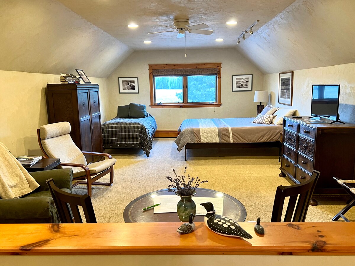 Vårt boende ligger i Woods Bay, ett litet samhälle nära Flathead Lake. Sviten där våra gäster bor är den bakre delen av vårt hus med egen ingång. Den består av en veranda, ett sovrum, ett privat badrum, ett vardagsrum och en Pavillon utomhus med grill och utrymme för matlagning. Vardagsrummet har ett skrivbord, en tele och bekväm kärlekssits samt Keurig kaffebryggare, mikrovågsugn och ett litet kylskåp. Det är bara en kort promenad till den gemensamma stranden, eller flera pubar, även en liten marknad.