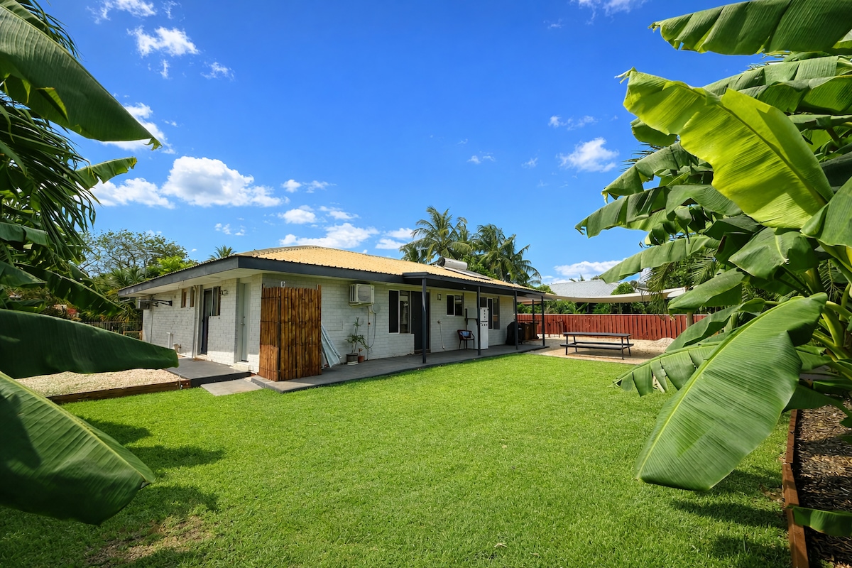 Rymlig 3-bädds retreat i fridfulla Cable Beach. Omgiven av frodiga tropiska trädgårdar, med en enorm pool, underhållningsdäck och lekplats för barn. Möbler i balinesisk stil och vacker aboriginsk konst ger värme och charm. Två sovrum med dubbelsäng delar ett badrum; master har en queen och ensuite. Massor av böcker, leksaker och spel för barnen. Beläget i en lugn familjevänlig återvändsgränd med gott om parkering utanför gatan, inklusive plats för en husvagn. Slappna av, varva ner och njut av Kimberley-vibbarna.