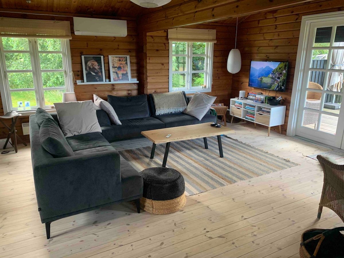 Välkommen till vår vackra timmerstuga, omgiven av naturen, och inom kort avstånd till Kattegat havet och de milda stränderna. Huset består av 3 rum + ett loft + ett loft. Byggdes 2008 och har moderna bekvämligheter såsom bastu, badtunnan, diskmaskin, diskmaskin, fiberinternet etc. Vi hyr inte ut till ungdomsgrupper. OBS: Före ankomst måste en deposition på 1 500 DKK betalas via Pay Pal. Beloppet återbetalas, exkl. elförbrukning. Ta med dina egna handdukar, lakan etc.