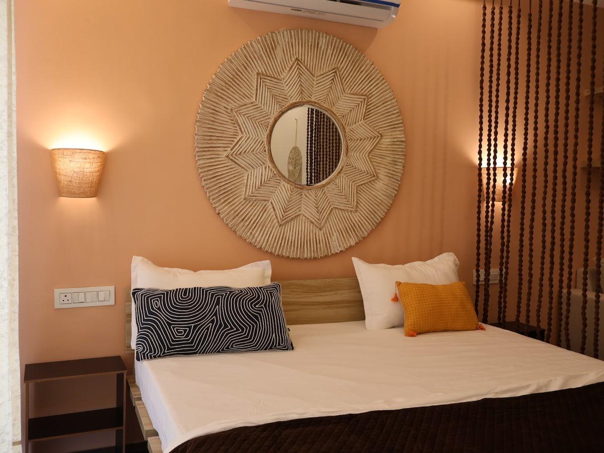 Denna öppna studiolägenhet följer minimalistiska designprinciper. Utrustad med ett pentry, två badrum, en full stor King-säng, en queen stor väggsäng, TV med Netflix, Hotstar, PrimeVideo, JioCinema och gratis WiFi, detta utrymme är kapabelt att bekvämt vara värd för en familj på fyra. Observera: Detta är en lägenhet med öppen planlösning och det finns inga privata sovrum, lägenheten ligger på andra våningen, så du måste gå upp två trappor. INGA FESTER VÄNLIGEN 🙏🏽 och RÖKNING FÖRBJUDEN 🚭